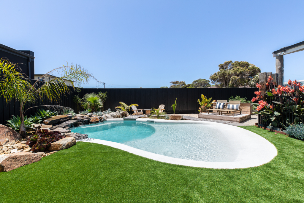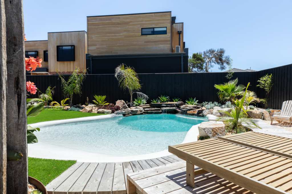 Soft curves, white tones, and a gentle waterfall define this relaxed coastal retreat. Designed for connection and calm, the pool’s freeform shape mirrors the flow of water itself – effortless, natural, and inviting. Surrounded by tropical planting and sun-soaked decking, it’s a space built for long afternoons and easy living.